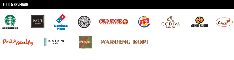 | F&B; CATERING | : | Cold Stone Creamery · Domino's Pizza · Godiva · Pizza Express · Starbucks |